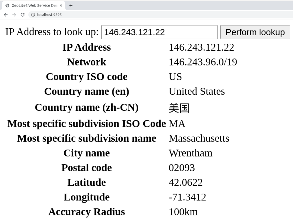 Now your webserver is running, and you can access http://localhost:9595 in your web browser and you should see the web form in which you can perform a lookup. Enter an IP address, or the special keyword me to look up your own IP, hit the “Perform lookup” button, and away we go!